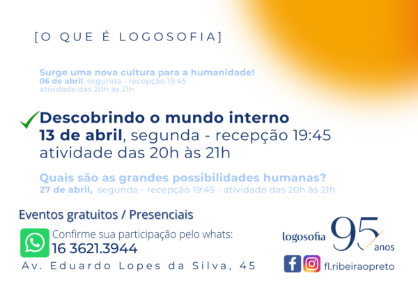 Surge uma nova cultura para a humanidade! No dia 06 de abril, às 20h, teremos o primeiro encontro presencial para conhecer e vivenciar a Logosofia. Depois também nos dias 13 e 27 de abril. Uma oportun...